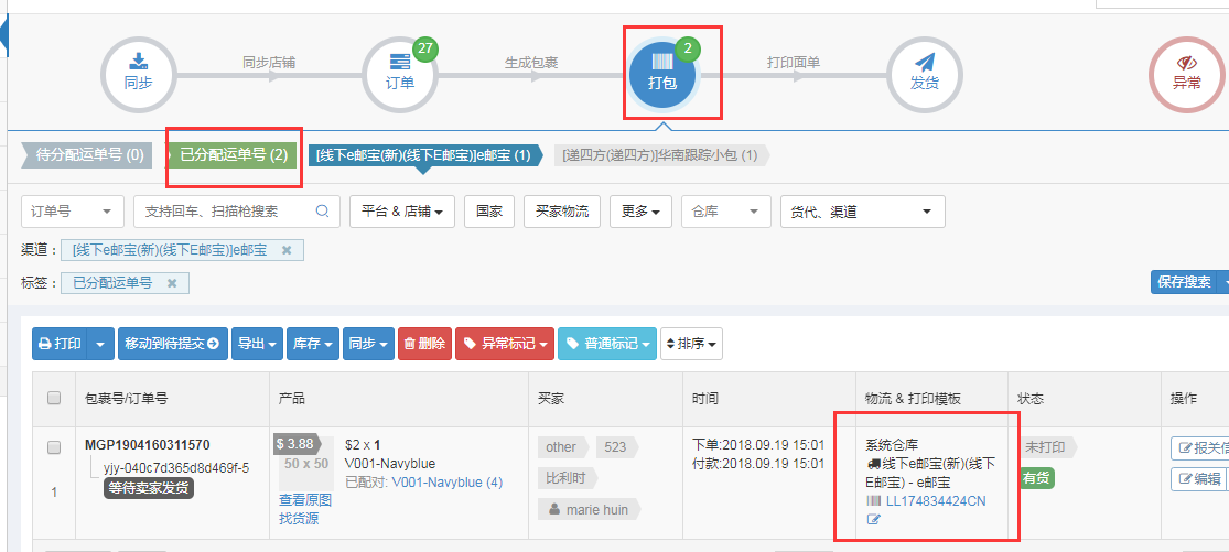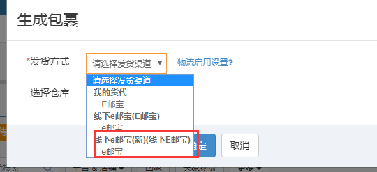 2.生成包裹:點(diǎn)擊生成包裹,選擇要發(fā)貨的渠道,這里我們選擇上面建的線下E郵寶(圖中以e郵寶為例),如下圖: