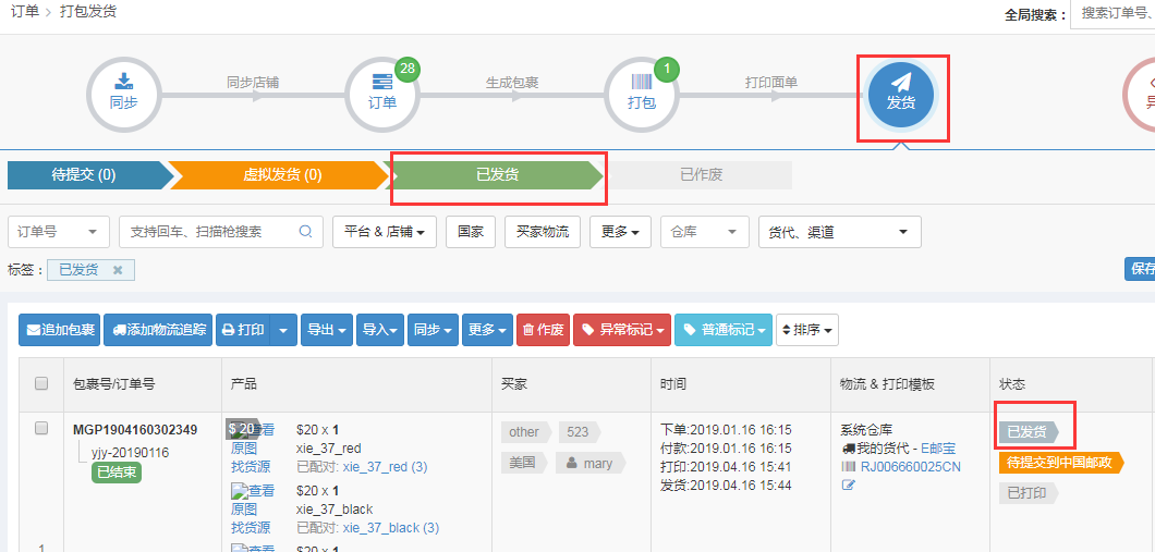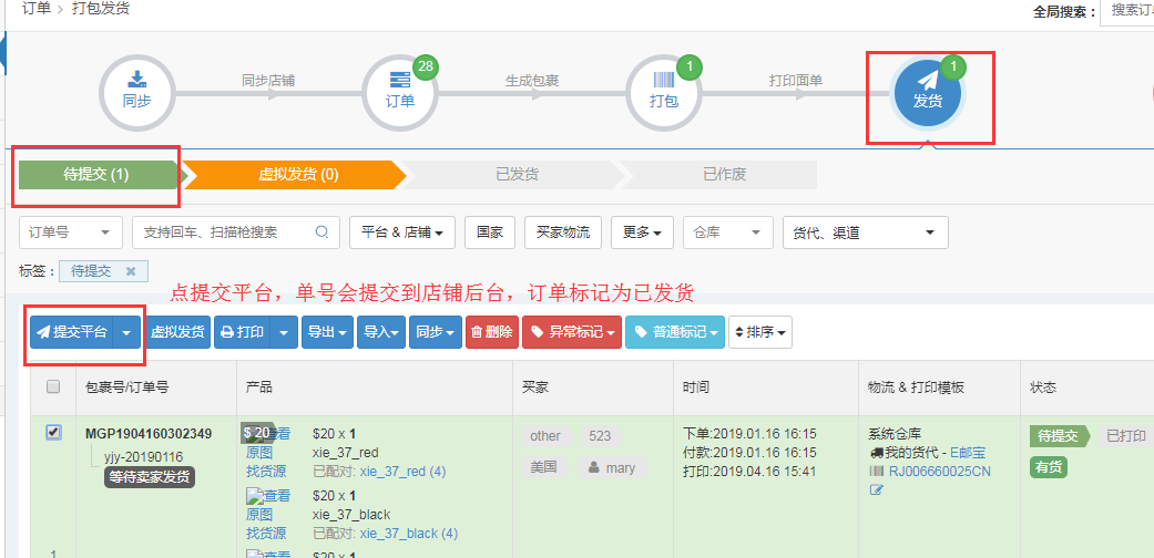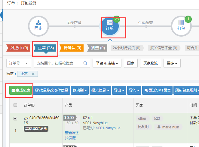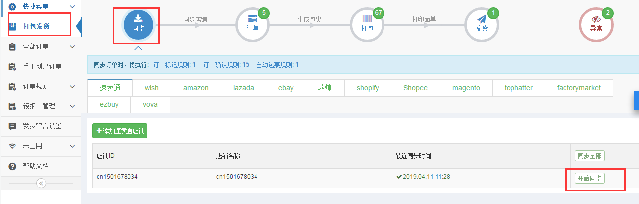 1.同步訂單:進(jìn)入打包發(fā)貨-->同步,同步速賣通或wish訂單。