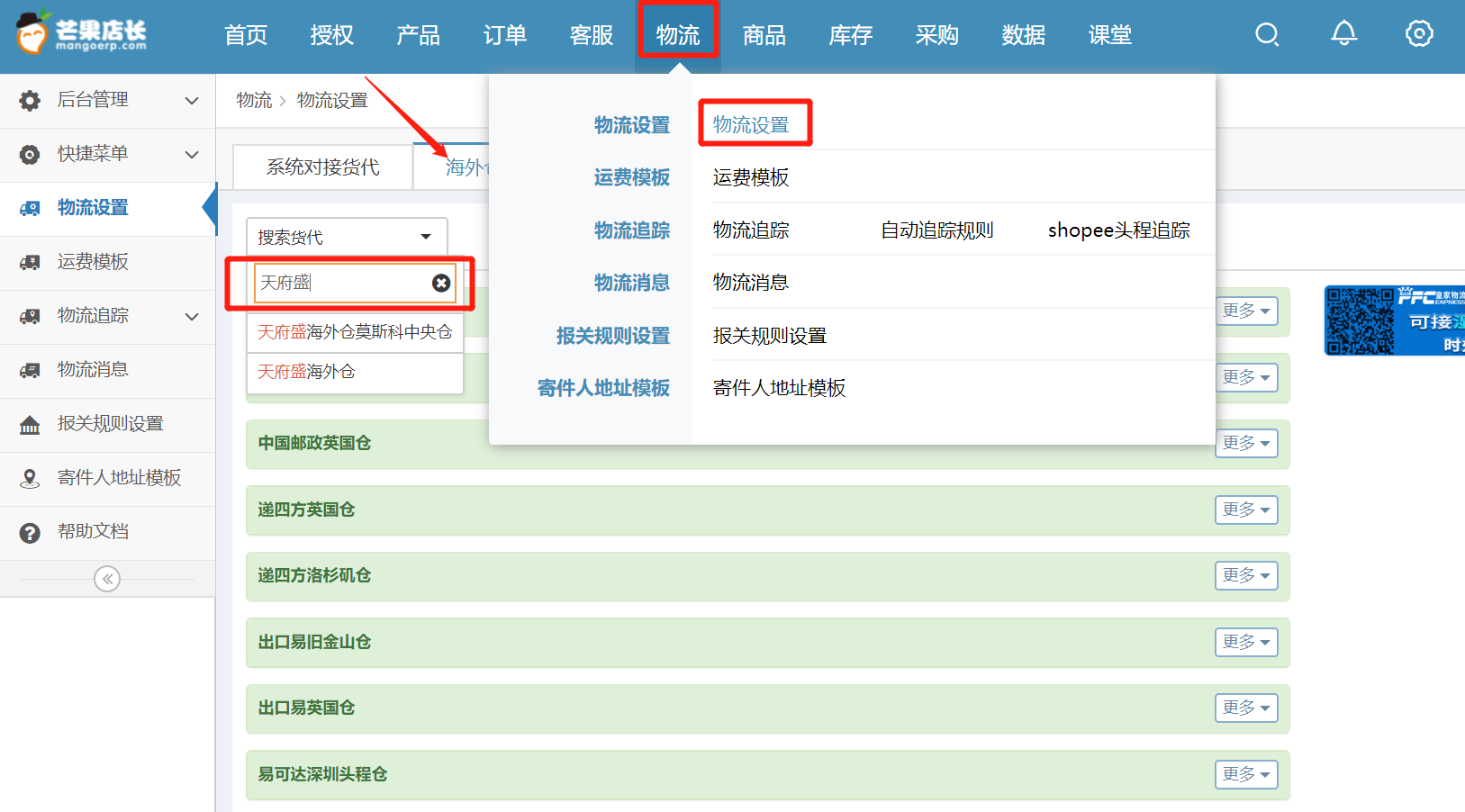 3.芒果物流設(shè)置中找到 —>天府盛海外倉莫斯科中央倉;