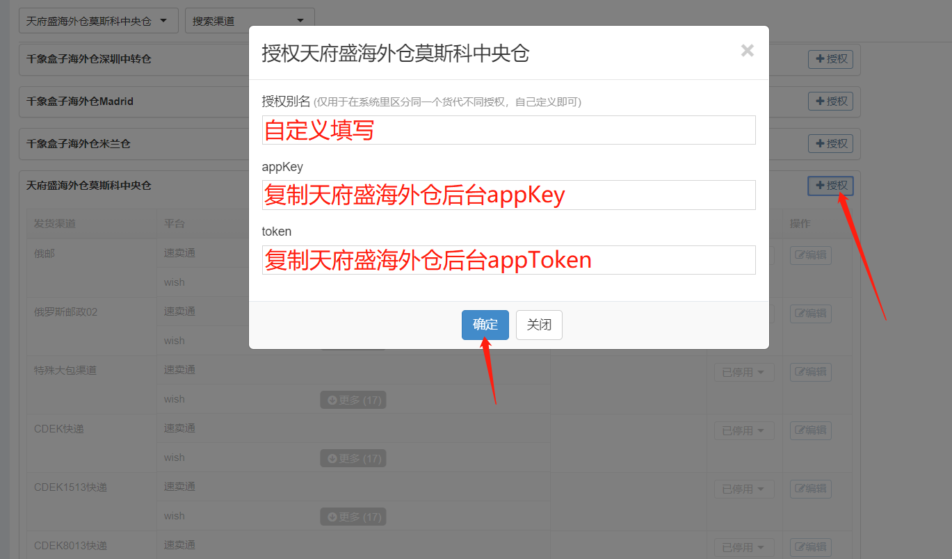 4.選擇需要的倉庫點(diǎn)擊末尾的【+授權(quán)】,填寫api信息點(diǎn)擊確定后即可啟用渠道進(jìn)行打單發(fā)貨;