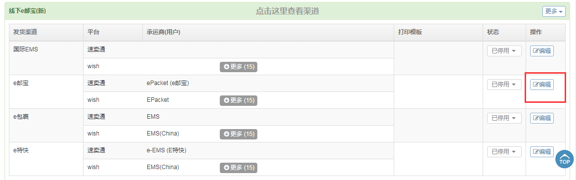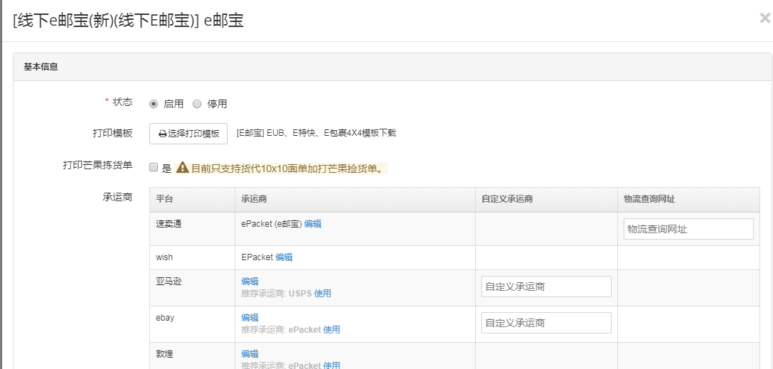 5.授權(quán)完成后,點(diǎn)編輯進(jìn)去(圖中以e郵寶為例),啟用要使用的渠道,并填寫對(duì)應(yīng)的寄件人 跟承運(yùn)商信息;