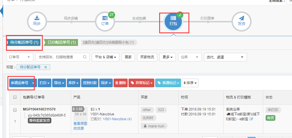 3.申請(qǐng)運(yùn)單號(hào):點(diǎn)擊打包,生成包裹后,訂單就會(huì)到打包里面,選擇包裹,點(diǎn)擊申請(qǐng)運(yùn)單號(hào),如下圖: