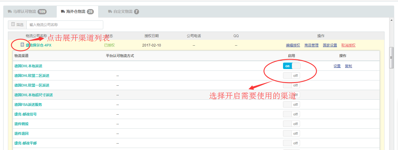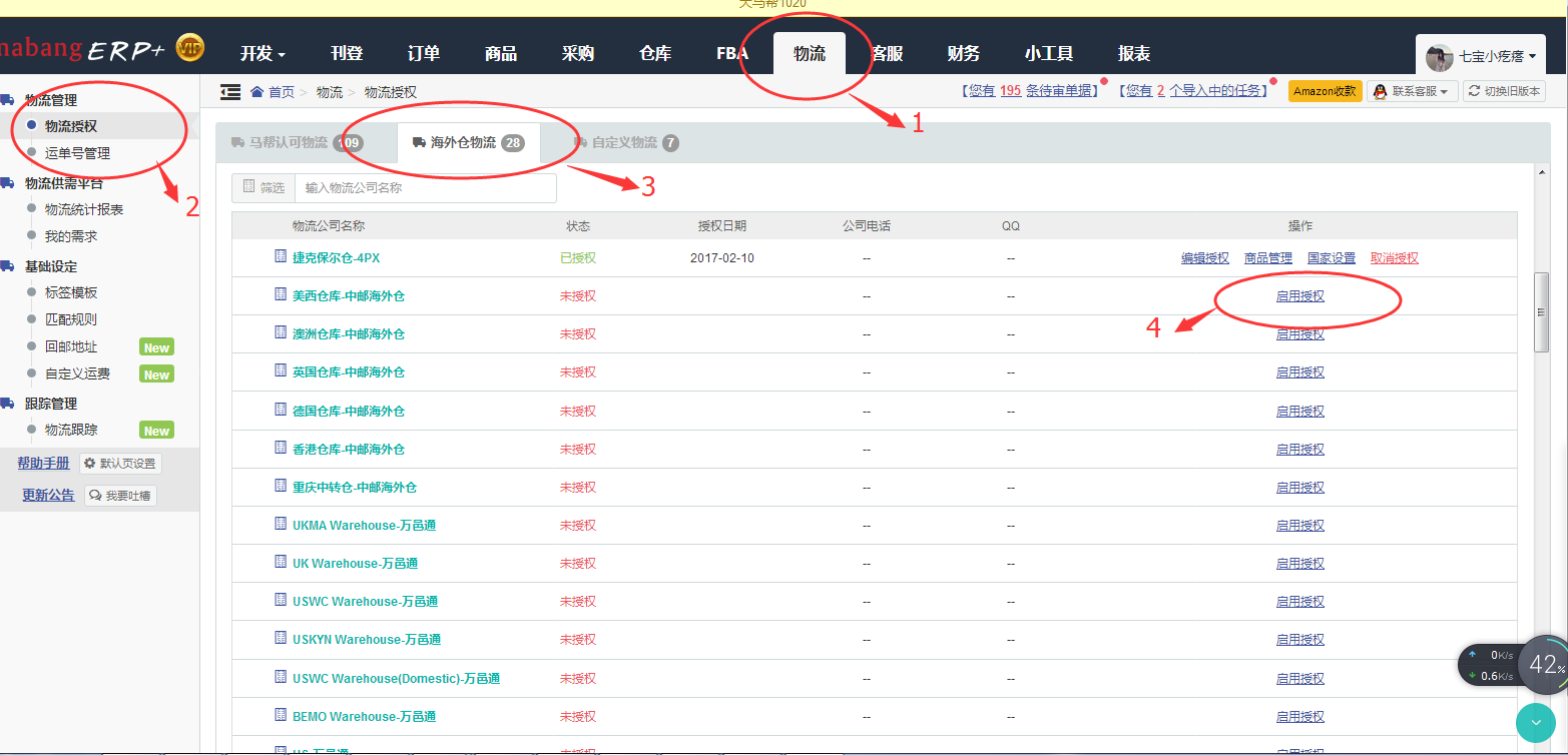 一、用戶在 物流--> 物流授管理-->物流授權(quán)-->海外倉物流,選擇要啟用的海外倉