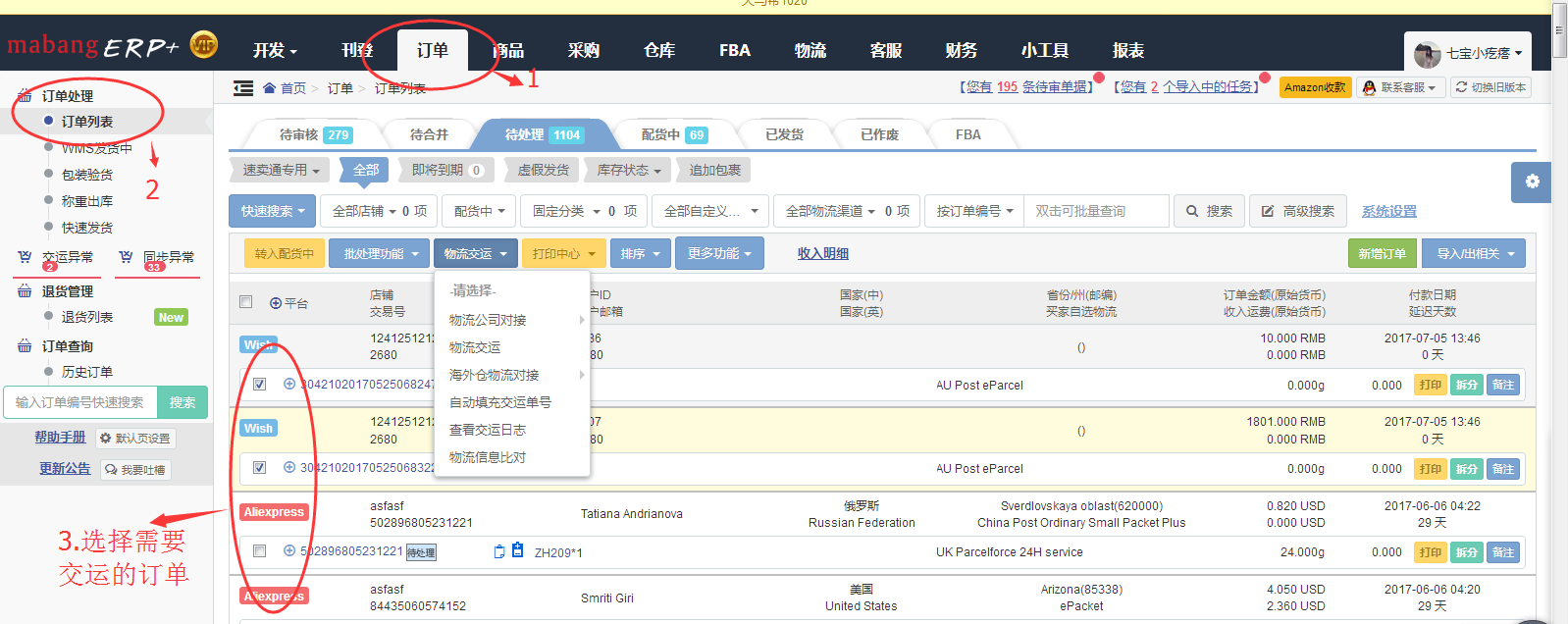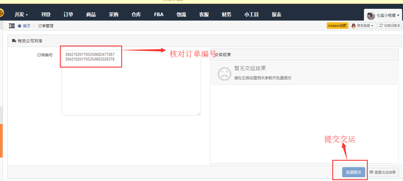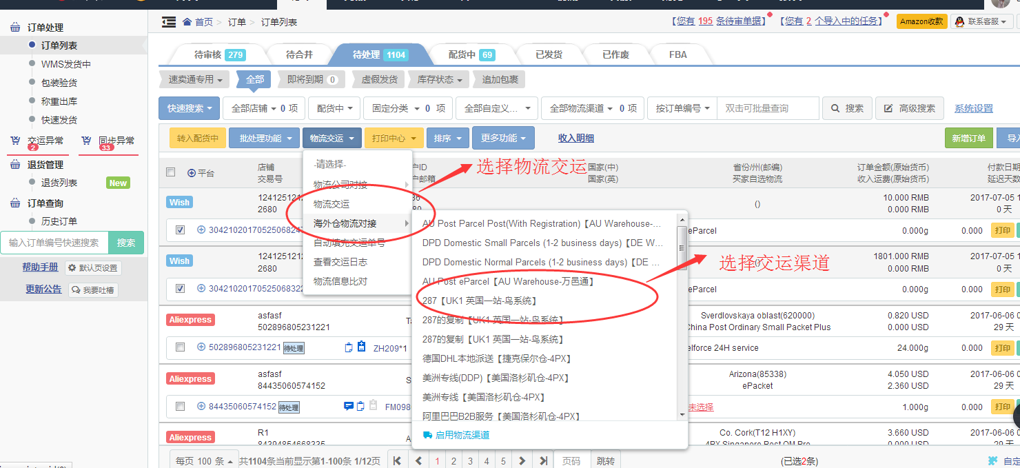 四、訂單-->訂單列表-->選擇需要交運(yùn)的訂單-->選擇用戶啟用的海外倉物流渠道