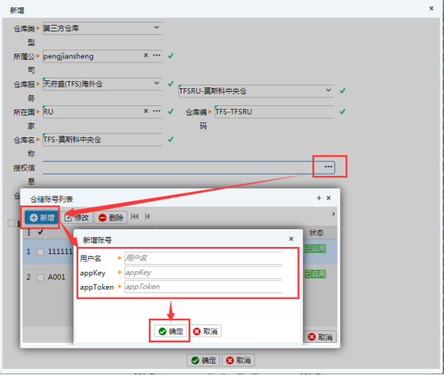 1.1 進入【基礎資料】-【倉庫資料】頁面,點擊新增,彈出新增頁面,倉庫類型選擇第三方倉庫,倉庫服務選擇天府盛(TFS)海外倉,選擇倉庫站點帶出倉庫信息,添加授權信息,填寫倉庫屬性、郵編,保存即可。