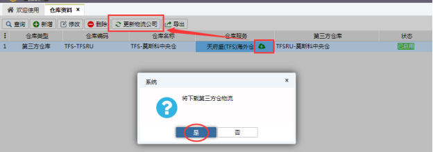1.2 新增倉庫之后,需要手動點擊“下載第三方物流”,再點擊“更新物流公司”,獲取第三方物流,獲取成功后,在【基礎資料】-【物流公司】頁面可查看到: