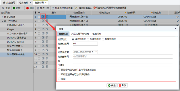 3、物流可修改基礎信息、關聯交易平臺物流、包裹限制,根據實際情況進行修改。