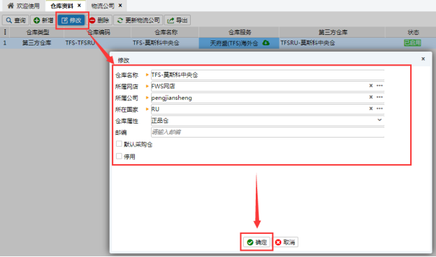 選擇倉庫,點擊修改,可以修改倉庫的倉庫名稱、所屬網店、所屬公司、所在國家、郵編、選擇是否默認采購倉、選擇是否停用。