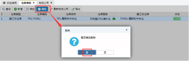 選擇要刪除的倉庫,點擊刪除,彈出提示,確認即可刪除。