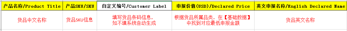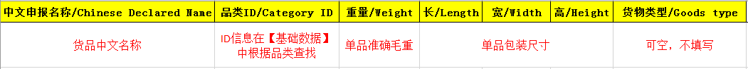 3.【模板】中貨品信息填寫簡(jiǎn)述(黃色底色為必填項(xiàng)),其中【最低申報(bào)價(jià)值】和【品類ID】在【基礎(chǔ)數(shù)據(jù)】表格中查詢。 (注:SKU和條碼中不能含有特殊符號(hào)和空格,“-”可用,最長(zhǎng)字段不可超過30個(gè)字符。重量單位為:KG; 尺寸單位為:CM)